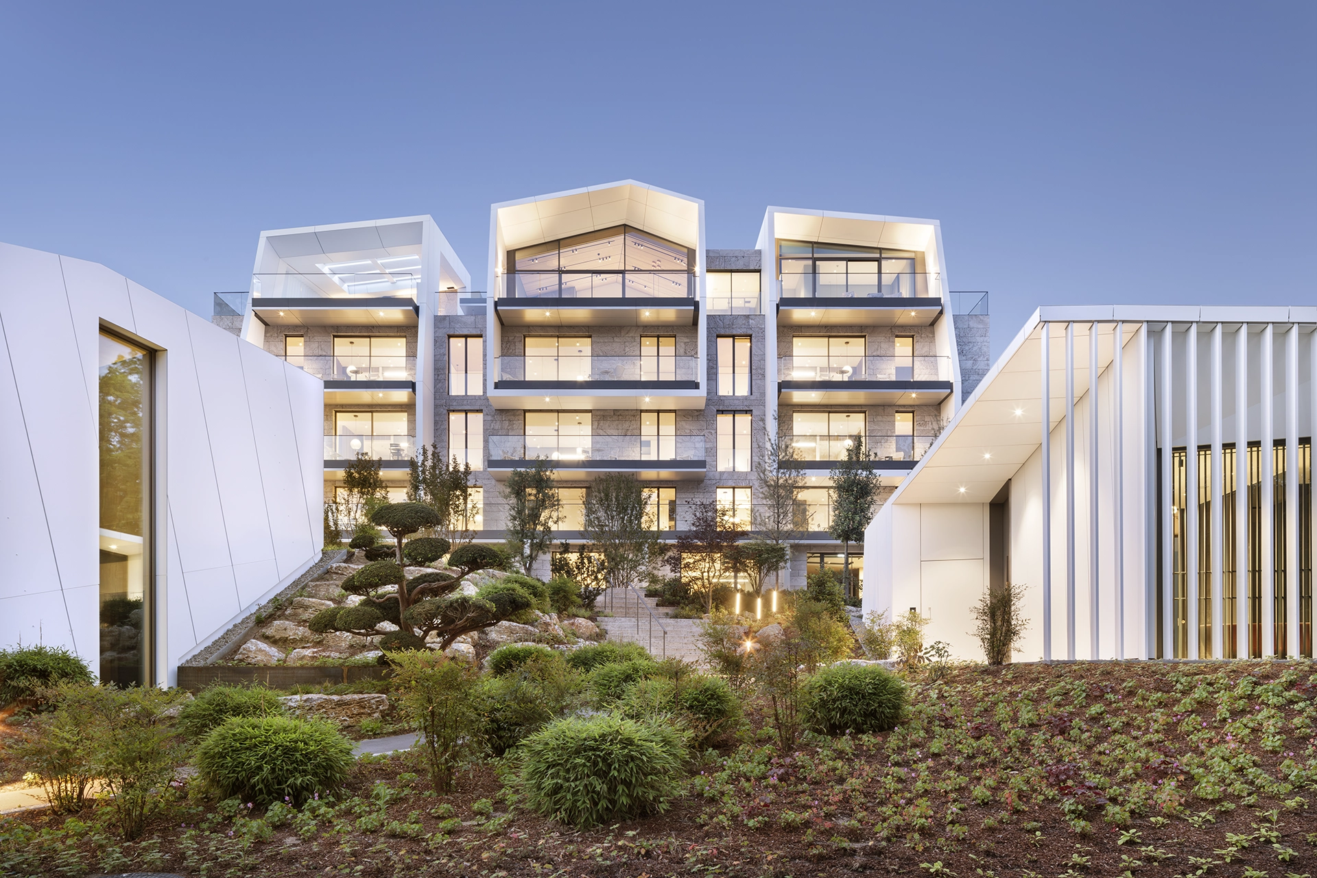 Eingangsbereich des Alea Park Boardinghouses mit markanter Fassadengestaltung.